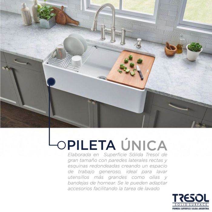 Descubre la combinación perfecta de diseño moderno y funcionalidad con la pileta Farm Sink Tresol. Sus dimensiones generosas de 595 mm x 400 mm x 200 mm ofrecen un espacio amplio y cómodo para todas tus tareas diarias en la cocina. Ideal para instalación en superficies sólidas, y mesadas de cualquier material. Su acabado liso, sin poros, facilita la limpieza y mantiene la elegancia en tu cocina. Fabricada con materiales de alta durabilidad, esta pileta es perfecta para el uso intensivo, garantizando resistencia y longevidad. Mejora tu cocina con la sofisticación y eficiencia de la pileta Farm Sink Tresol.